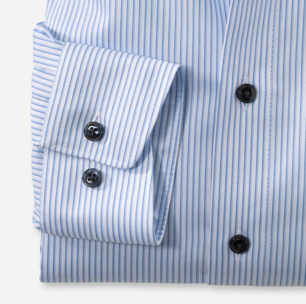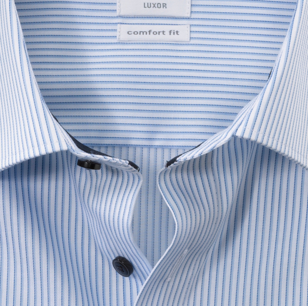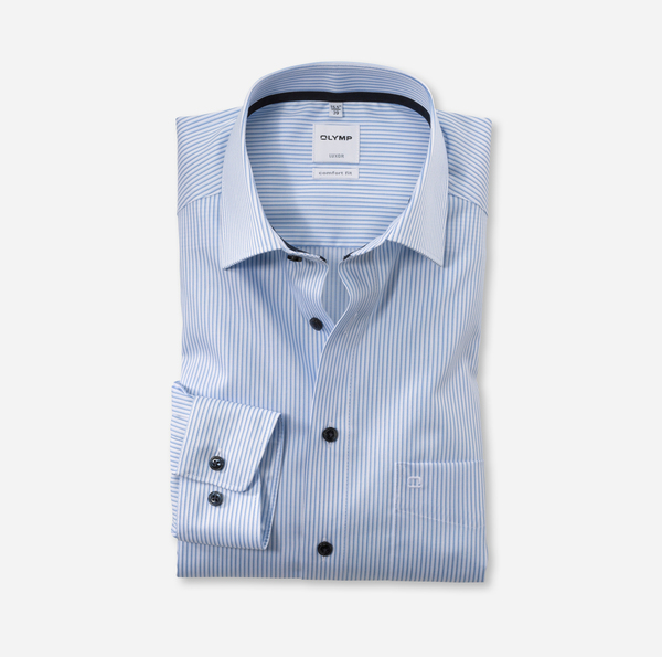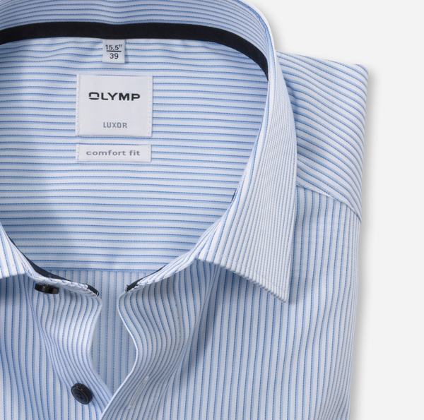 Premium-Qualität und außergewöhnliches Design spielen die Hauptrolle in der Businesshemden-Linie OLYMP Luxor comfort fit. Auch nach langen Arbeitstagen sehen die geradlinig geschnittenen Hemden aus wie frisch gebügelt. Die griffige Baumwoll-Textur dieses Hemds ist schließlich knitterfrei und steht für den Slogan Einfach waschen, trocknen, anziehen. Das exquisite Streifen-Dessin lässt sich mit beabsichtigtem Eyecatcher-Effekt zum zeitgemäßen Business-Anzug kombinieren. Außerdem sorgt ein smarter New Kent dafür, dass die Seriosität selbst mit lässig geöffnetem Kragenknopf gewahrt bleibt.