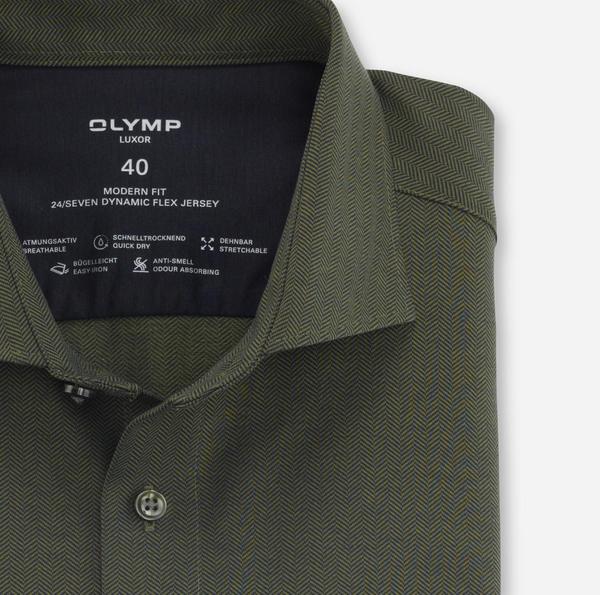Klassiker neu interpretiert. Das charaktervolle Herringbone-Muster gewebt in Dynamic-Flex-Jersey macht aus diesem OLYMP Luxor 24/Seven modern fit Businesshemd einen echten Hingucker. Die Synthese von Funktion, Style und Komfort entspricht dem Look und den Anforderungen der heutigen agilen Geschäftswelt. Die atmungsaktiven, schnelltrocknenden, elastischen, bügelleichten und geruchshemmenden Materialeigenschaften der Baumwolle-Elastahn-Textur sind das zielgerichtete Produkt für den Mann von heute.