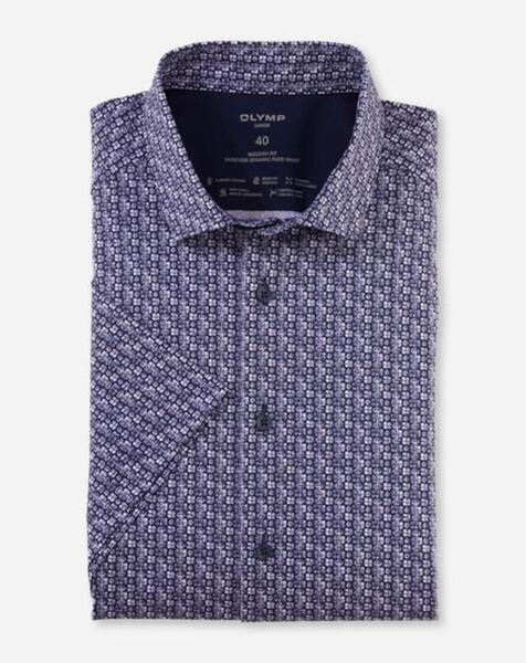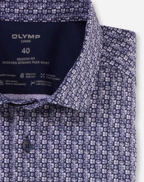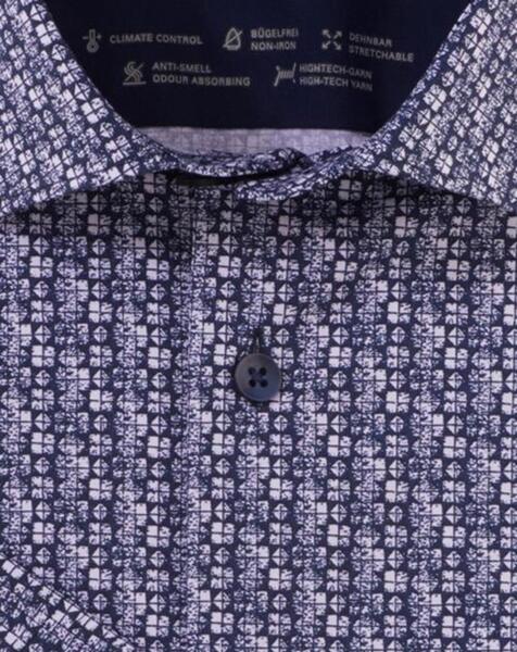Pixelscharfer Auftritt gewünscht. Die neuen Digital-Prints machen's möglich. Grafisches Minimal-Muster in Marine auf Weiß, körpernaher Schnitt und der sportive Modern Kent ergeben den modischen Business-Auftritt. Zusätzlich punktet dieses Kurzarm-Businesshemd OLYMP Luxor modern fit 24/Seven mit Climate Control. Das innovative Hightech-Gewebe aus feinen Baumwolle-, Elasthan und Polyfasern sorgt für hautsympathischen Tragekomfort. Es ist atmungsaktiv, bügelfrei, stretchy sowie temperatur- und feuchtigkeitsregulierend. Mit attraktivem Kontrastbesatz, ohne Brusttasche.
