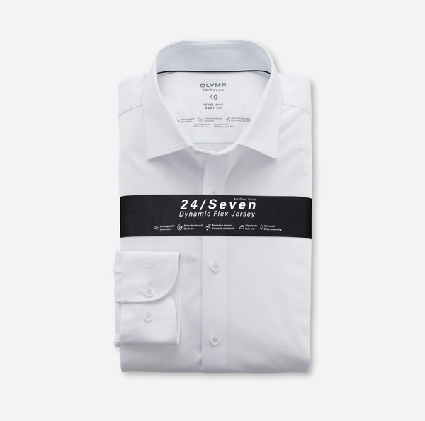 Wer ein Businesshemd mit perfekter Balance von Optik und Tragekomfort sucht, landet unweigerlich bei den Hemden der Linie OLYMP 24/Seven Dynamic Flex Jersey. Als besonders moderne und innovative Variante begeistert dieses OLYMP Level Five: Die feine Baumwollqualität liegt angenehm leicht auf der Haut und bietet mit seinen atmungsaktiven, schnelltrocknenden und geruchsneutralisierenden Eigenschaften die Features eines Funktionshemdes. Ein smarter Allrounder in schmaler Body-Fit-Silhouette, mit hohem Stretch-Anteil und modischem New York Kent.