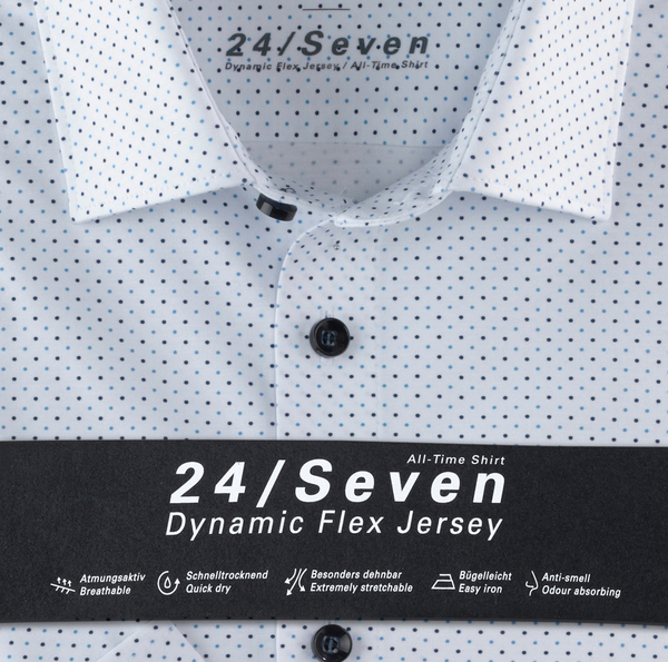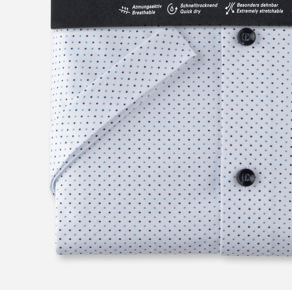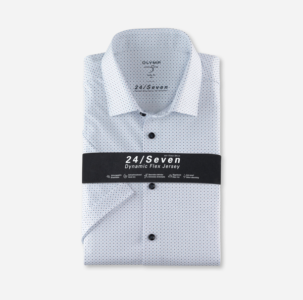 Lässige Eleganz vom Feinsten: Die 24/Seven Dynamic Flex Jersey-Shirts führen das bewährte Design der Linie OLYMP Level Five body fit auf ein neues Level! Die beliebte Jersey-Line kombiniert gekonnt die maskuline Eleganz klassischer Herrenhemden mit dem unvergleichlichen Tragegefühl bequemer Jersey-Ware. Ob als lockerer Business- oder gehobener Casual-Style, zu Anzug, Sakko oder Jeans getragen: Dem trendaffinen Träger bieten sich unzählige Einsatzmöglichkeiten. Der extra feine Baumwoll-Jersey begeistert durch hochelastische Stretch-Qualität und bietet so passgenauen Sitz bei vollendetem Tragekomfort. Das vielseitige OLYMP Level Five Kurzarm-Jersey-Hemd zeigt ein businessaffines Micro-Dessin und ist mit einem modischen New York Kent ausgestattet. Für einen innovativen Office-Look voller Individualität und Dynamik!