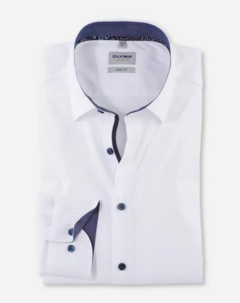 Moderner Business-Klassiker in strahlendem Weiß. Das unifarbene OLYMP Level Five überzeugt durch seine frühlingshafte Qualität mit hoher Fadendichte und bügelfreundlicher Pflegeleichtigkeit. Als modische Eyecatcher wirken dezente Farbkontraste. Der Body Fit ist ideal für sportlich Schlanke und wird durch einen Modern Kent komplettiert.