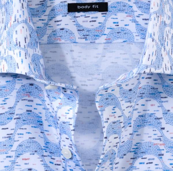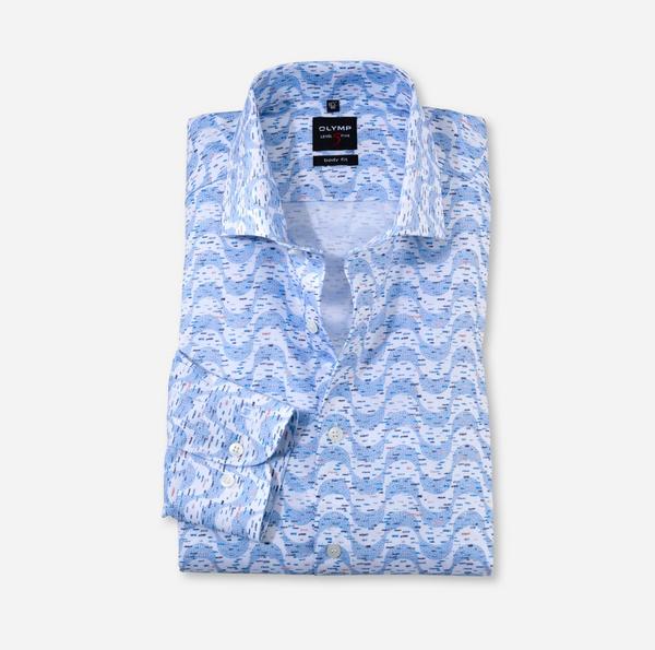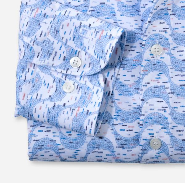 Dieses wundervoll leichte OLYMP Level Five zeigt einen wellenförmigen Print mit kunstvollen Mosaik-Details. Der hochwertige Comfort Stretch besticht durch seinen kühlen, glatten Griff und harmoniert damit auch haptisch ideal mit der Frühlings- und Sommersaison. Der taillierte Body Fit zeugt von trendaktuellem Stilgespür und auch der Kragen passt perfekt ins Konzept: Ein Royal Kent vermittelt souveräne Eleganz und besticht sowohl mit als auch ohne Krawatte. Für eine überzeugende Performance auf jedem Parkett.