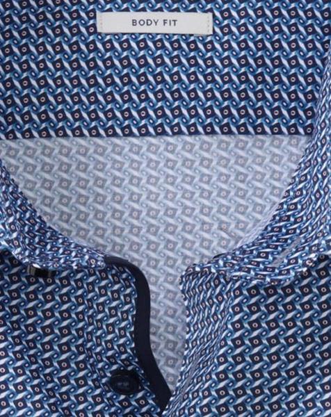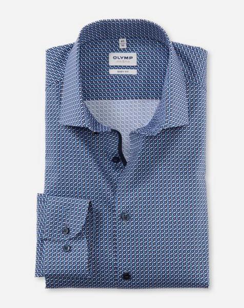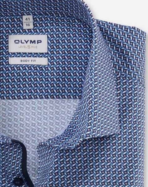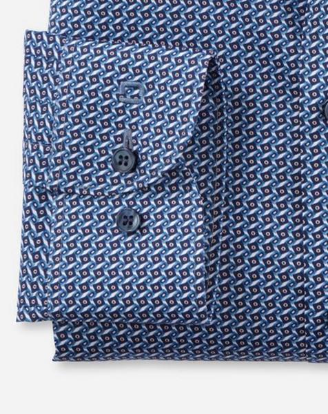 Das OLYMP Level Five Businesshemd für den smarten Office-Look. Das grafische Dessin in Marine macht den modischen Unterschied. Das Hemd ist körperbetont geschnitten und in bewährtem Twill-Comfort-Stretch aus feinen Baumwollgarnen und dynamischen Elastolefin-Fasern gefertigt. Es garantiert hautsympathischen Tragekomfort und zeitsparendes, bügelleichtes Handling. Sportiv vollendet mit dem innovativen Modern-Kent-Kragen und kontrastivem Innenbesatz.