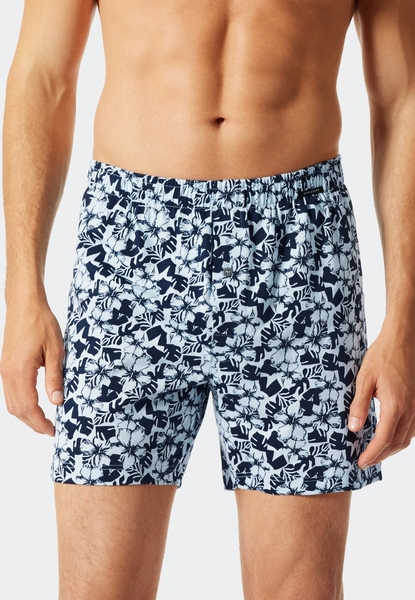 Diese Herren-Boxershorts sind das perfekte Duo für jeden Anlass: Ganz klassisch in maskulinem Dunkelblau oder mit Hawaiiblumen-Motiv in frischem Hellblau – der Gute-Laune-Print ist ein echter Hingucker. Bequemer Single Jersey aus 100% Baumwolle macht das Multipack extra hautfreundlich. Zusätzlich begeistern diese Shorts durch einen bequemen Bund mit funktionaler Knopfleiste. Ein Doppelpack in bester SCHIESSER-Qualität für Herren, die Freude an ihrer Tagwäsche haben wollen!