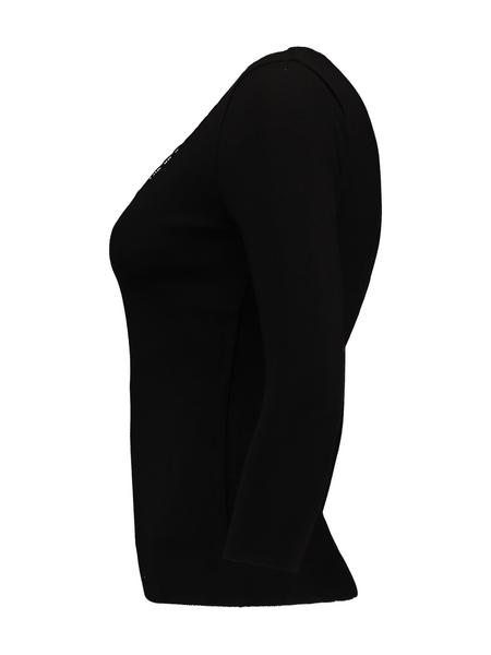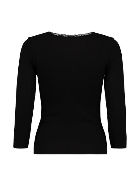 3/4 Arm Shirt mit V-Ausschnitt. Die Passform ist körperbetont, die Kanten des Ausschnitts hat einen Spitzenbund.