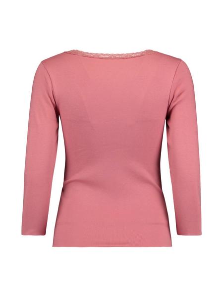 3/4 Arm Shirt mit V-Ausschnitt. Die Passform ist körperbetont, die Kanten des Ausschnitts hat einen Spitzenbund.
