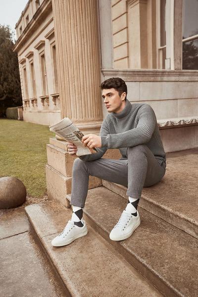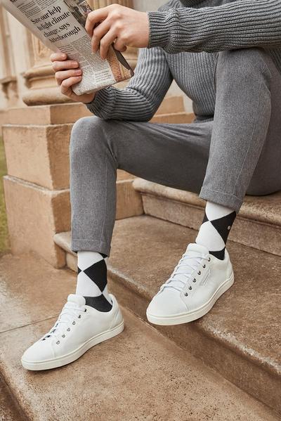 Der Einsatz von nachhaltigen Garnen macht aus einer klassischen Socke ein echtes Statement-Accessoire. Neben Organic Cotton und recyceltem Polyamid punktet die Herren-Socke mit ihrem Argyle-Muster samt Überkaro entlang der Raute.