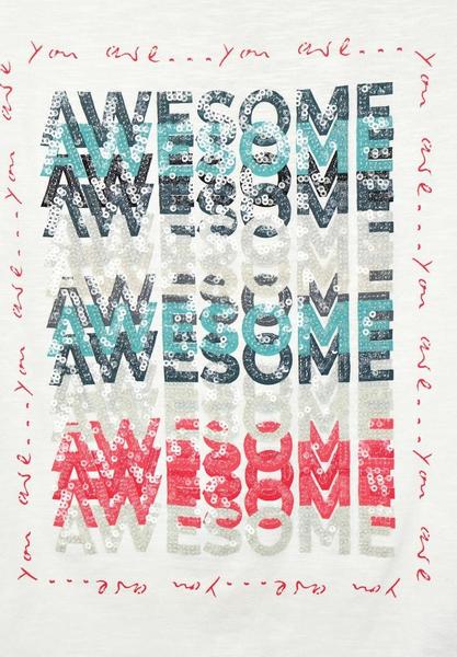 Awesomeness: Dieses Langarmshirt bekommt seinen einzigartigen Charme durch den coolen Aufdruck. Der Schriftzug wird durch die schimmernden Pailletten perfekt in Szene gesetzt und verleiht dem Look tolle Highlights. Die langen Ärmel und der Rundhalsausschnitt sorgen für die sportliche Note.\n\n\n Shirt mit Aufdruck\n Pailletten und Schriftzug\n Flammgarn\n Rundhalsausschnitt\n Maße bei EU-Größe M ca.:\n Länge 65cm, Brust 52cm, Saumweite 54cm\n Material: 100% Baumwolle