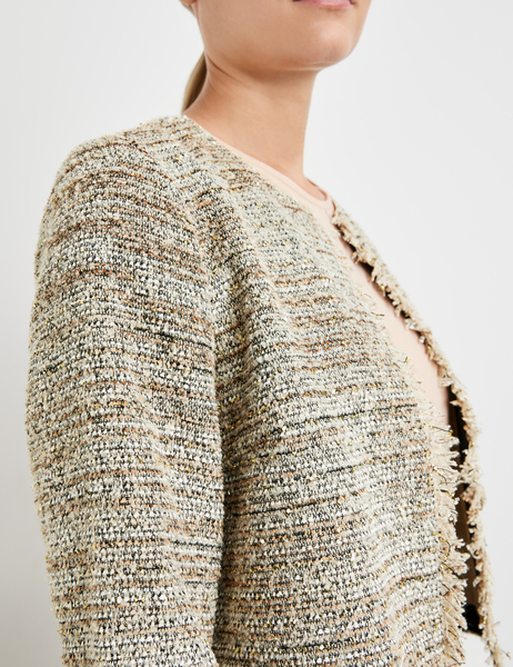 Fransenkanten. Imposante Struktur-Qualität mit Glanz-Details. Eleganz neu interpretiert: Unsere Blazerjacke im kurzen, kastigen Stil besticht mit weiblichem Charme. Die kunstvolle Struktur-Qualität mit Glanz-Details macht sie zum Blickfang. Für Frauen, die Stilbewusstsein zeigen.