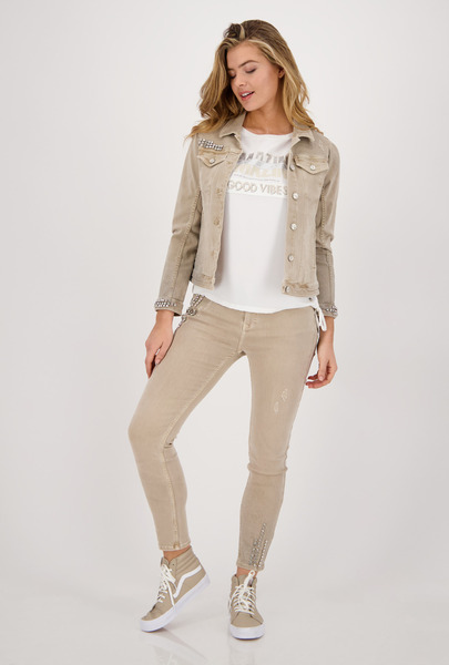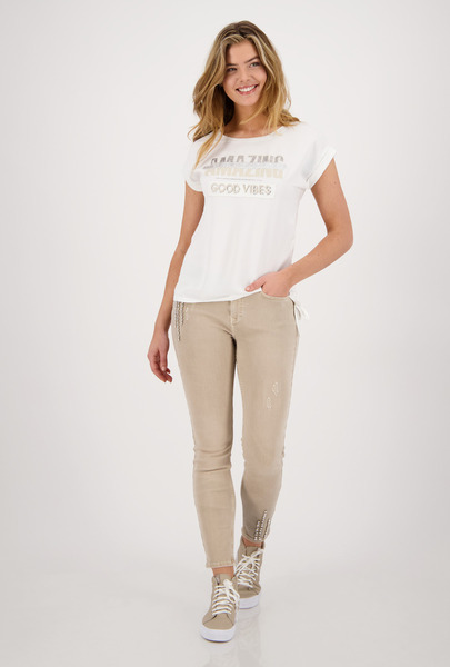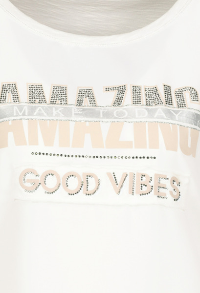 Aus edlem Material-Mix, exklusiv und zeitlos designt ist dieses Blusenshirt so schön, dass es alle anderen zum Nebendarsteller macht. Hochwertige Webware trifft auf fließende Jerseyware und verspricht einen angenehmem Tragekomfort. Das Resultat: ein wunderbar angenehmes It-Piece mit geradem Fit, Rundhals mit Lurex-Overlocknaht, angedeutetem, überschnittenem Kurzarm mit Ärmelaufschlag, Tunnelzug mit Bindeband zu Raffen der linken Bodyseite. Die Vorderseite wird dank eines platzierten Schriftdruckes mit glamourösem Strass-, Glitter- und Lackdruck zum Highlight des Flammgarn Modells. Worauf waren Sie noch.