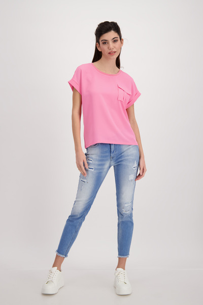 Leicht und unbeschwert präsentiert sich das unifarbene Blusenshirt von monari. Die angenehme Kombination aus Webware und Baumwolljersey macht die Shirtbluse mit aufgesetzter Pattentasche zu einem wahren Wohlfühlwunder. Der Kurzarm endet mit einem Ärmelaufschlag. Kombinieren Sie nach Lust und Laune und genießen Sie den Tag!