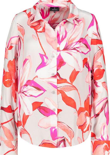 Elegante Satinbluse aus leichtem, fließendem Stoff gefertigt. Sie verfügt über ein Blumenmuster sowie einen Hemdkragen.
