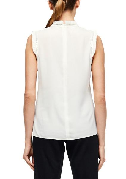 edles Blusentop aus zarter Crêpe-Ware, Stehkragen aus Spitzenborte und plissierter Blende; mit nathfeinem Reißverschluss im Nacken, über den Schultern ebenfalls mit Dekoborte und gelegten Fältchen, ohne Ärmel, Regular Fit; Rückenlänge bei Größe 36 ca. 62 cm, semitransparente, fließende Webware mit mattem Finish