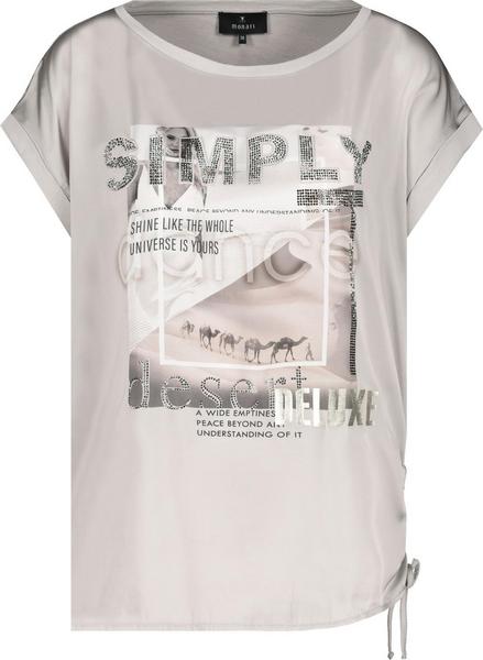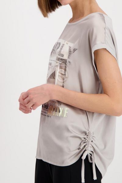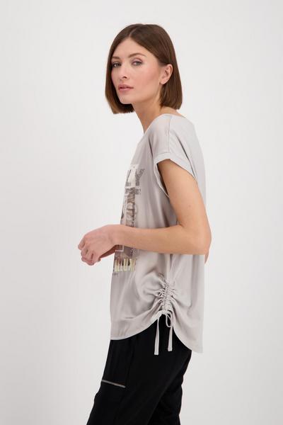 Das aus Webware gefertigte Vorderteil dieses Blusenshirts von monari, im Zusammenspiel mit dem aus Baumwolljersey gefertigten Rückenteil verspricht einen angenehmen und qualitativ hochwertigen Tragekomfort. Regular Fit mit Rundhalsausschnitt, Kurzarm, Ärmelenden mit Ärmelaufschlag und überschnittenen Schultern. Die linke Bodyseite kann mit einem Tunnelzug und Bindeband stilvoll gerafft werden. Die Vorderseite wird von einem angesagten und modischen Fotoprint mit Folienschrift und Glitzerschrift geziert und verleiht dem Kurzarm Blusenshirt einen glamourösen Touch. Ein echter Blickfang.