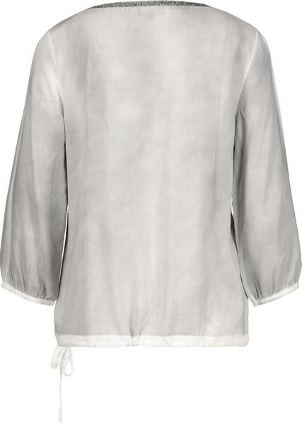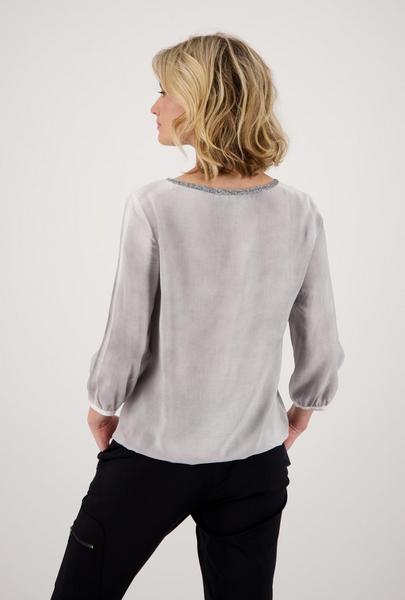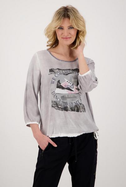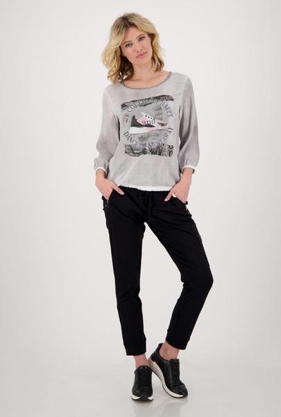 Schicke Casual-Bluse aus reiner Viskose: soft, leicht, angenehm kühl im Griff. Leger geschnitten und mit kontrastfarbigen Ärmelenden mit elastischem Gummizug und kontrastfarbigem Saum mit Tunnelzug und Bindeband. Blickfang: der Rundhalsausschnitt mit glamourösem Lurexband und die Vorderseite mit femininem Turnschuhdruck mit glitzernder Schrift und funkelnden Strassdetails. Überzeugen Sie sich selbst und kombiniere Sie zu einer unifarbenen Hose.