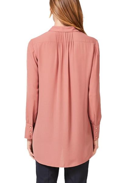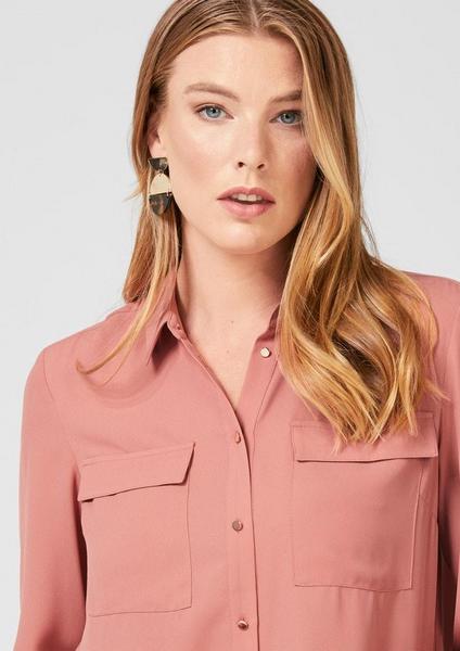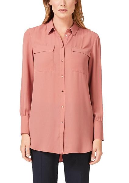wahlweise Unifarben oder mit Allover-Print , klassischer Hemdkragen und durchgängige Glanzknopfleiste, zwei aufgesetzte Pattentaschen auf der Front, lange Ärmel mit breiten Manschetten und drei Knöpfen, Biesenfalten am Nacken , abgerundeter Saumabschluss mit verlängertem Rückenteil, lockere Passform; Rückenläng bei Größe 36 ca. 81 cm, leichte, fließende Webware in feiner Crêpe-Qualität,