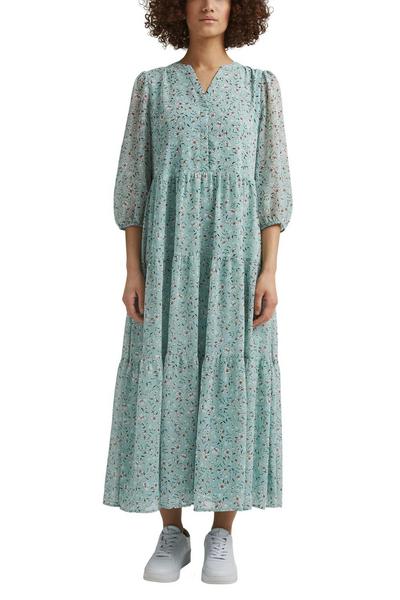 * Fein strukturierte Crinkle-Qualität aus recyceltem Polyester * Blickdicht gefüttert * Kelch-Ausschnitt mit Knopfleiste bis zur Taille * A-Linie mit abgestuftem Volantsaum * Ballonämel in 3/4 Länge und mit Gummibund an den Ärmelenden * Allover Blüten-Print * Angesagte Maxilänge