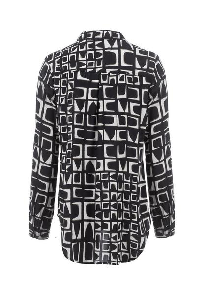 Langärmelige Bluse mit graphischem Allover-Print. Mit verborgener, durchgehender Knopfleiste, aufkrempelbaren, fixierbaren Ärmeln und hinten etwas längerem Saum. Der untere Bereich der Front ist seitlich mit diagonal verlaufenden Knopfleisten dekoriert. Im Rücken mit einer Kellerfalte für einen schönen Fall.