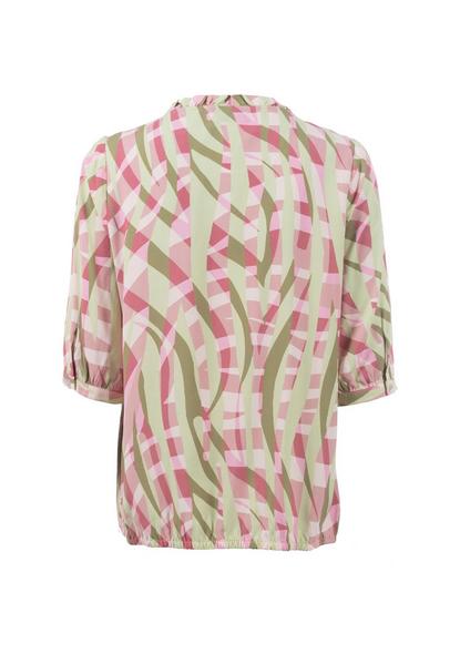 Schönes, feminines Blusenshirt mit gerafftem Kelchausschnitt mit Bändern. Ein großes, abstrakes Allover-Dessin gibt den Ton des Casual Looks an. Die dreiviertel Ärmel, die am Ende leicht gerafft und geschlitzt sind, lassen sich mit einem schimmernden Knopf schließen. Für den perfekten Tragekomfort mit Gummizug im Saum.