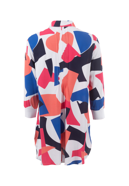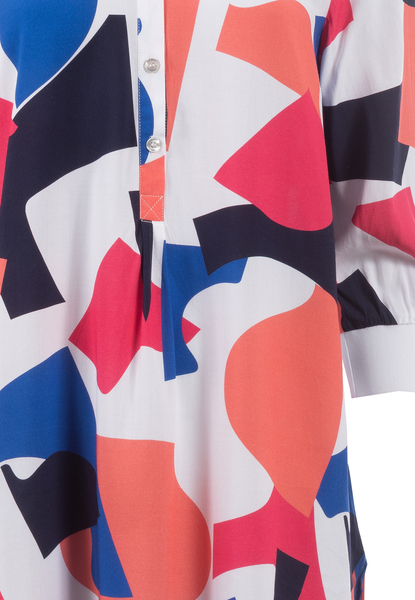 Schöne, lange Schlupfbluse mit halber Knopfleiste, dreiviertel Ärmeln mit elastischem Rippbund und leicht abgerundetem Saum. Ein großer abstrakter Graphikprint zaubert zudem eine schöne Figur. Hinten mit abgesteppten, vertikalen Rückenbiesen.