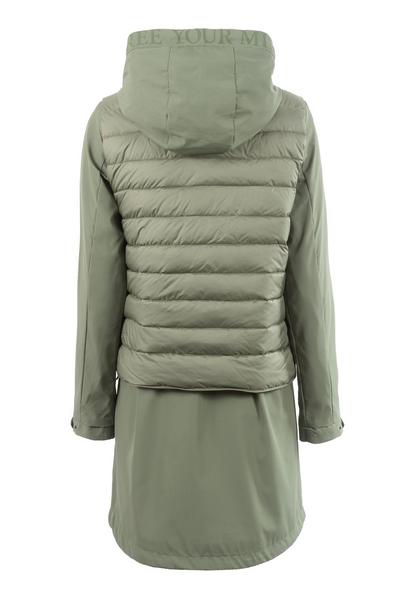 Bei diesem raffinierten Look lässt sich die kurze Steppweste über den Softshell-Parka ziehen und im Nacken mit einem Knopf fixieren. Beide Teile können aber auch getrennt voneinander getragen werden. Die Steppweste mit Stehkragen lässt sich mit Druckknöpfen schließen, der Mantel mit einem Reißverschluss. Die praktischen Details des Parkas sind seine Kapuze, Seitentaschen sowie Tunnelzüge an Taille und Saum zur Weitenregulierung.