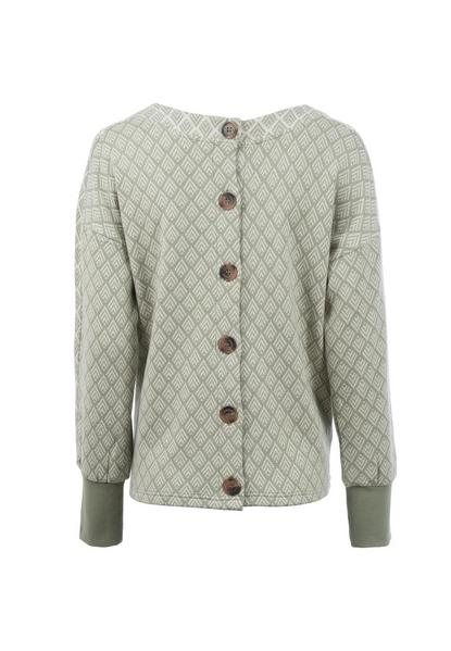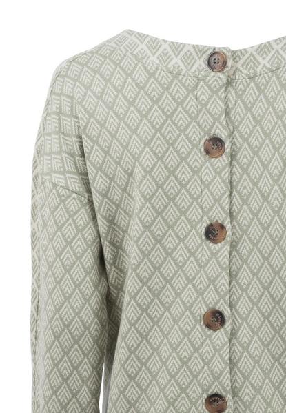 Bei der Strickjacke mit trendigem, graphischem Allover-Print lässt sich die Vorderseite mit Knopfleiste auch als Rückseite tragen. Die andere Seite ist mittig mit einem Längsstreifen mit umgekehrter Farbfolge geschmückt. Für extra Komfort mit elastischen Ärmelbündchen.