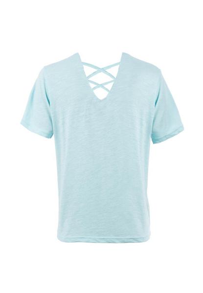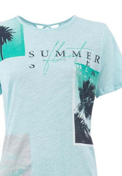 T-Shirt mit Palmen-Fotoprint Lässiges T-Shirt mit Palmen-Fotoprint, Wording-Artworks und silbernen Metallplättchen auf der Frontseite. Im Rücken mit V-Ausschnitt und überkreutzten Bändern.