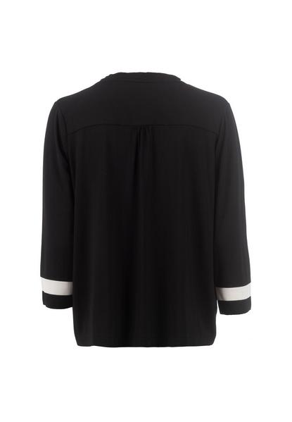 Shirtjacke mit 3/4 Armen Leichte, sportlich-elegante Shirtjacke mit 3/4 Ärmeln. Die schicke Jacke lässt sich mit zwei Druckknöpfen schließen. Die Ärmelenden aus feinen Viskosestrickbündchen sind mit einem weißen Streifen versehen.