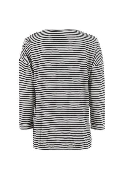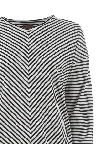 Leichtes, diagonal gestreiftes Shirt mit dezentem V-Ausschnitt. Eine abgesteppte Längsnaht mittig der Front und ein feines Allover-Cut Out-Muster lockern den Look auf. Mit kleinem Ärmelaufschlag mit changierenden Knöpfen und Gummizug im Saum.
