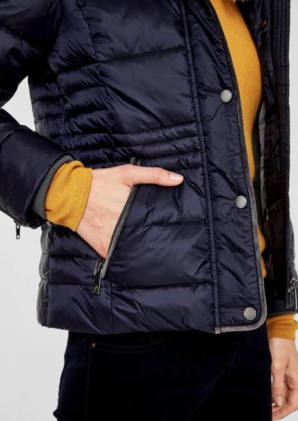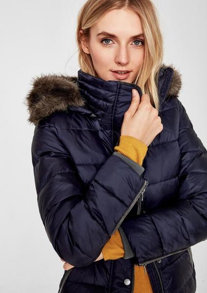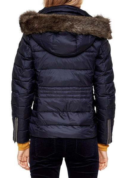 glänzende Optik mit figurschmeichelnder Steppungen, abnehmbare Kapuze mit ebenfalls abnehmbarem Fake Fur-Panel, Kragen mit Samtfutter und verdeckter Front-Reißverschluss mit Druckknopfblende, Ärmelabschlüsse mit Zipper , zwei Eingrifftaschen mit Reißverschluss und softem Fleece-Lining, samtige Paspelierung an Blende und Taschen, taillierte Passform; Rückenlänge bei Größe 36 ca. 64 cm, glattes Material mit spezieller Wattierung aus Daunen, Federn und Polyester; mittlerer bis hoher Wärmegrad