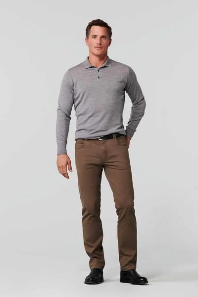 Diese Chino im Wool Look überzeugt durch den weichen BIO-Baumwollstoff in Bi-Colour. Bei den Gesäßtaschen wird das modische Muster der Innenseite des Stoffes sichtbar. In geschmackvollen Farben ist Ihnen ein gelungenes Outfit gewiss. Die Stretch-Qualität sowie der besondere Rundbund sorgen für Tragekomfort. Das buntgewebte Innenfutter und die hochwertigen Knöpfe machen die Besonderheit einer MEYER Hose aus. 100% klimaneutral, FAIR & verantwortungsvoll in Europa produziert!