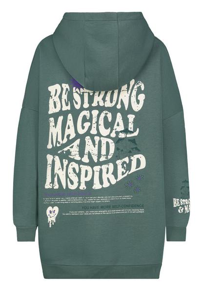 DOB langer Oversize Sweat Hoodie, überschnitteneSchultern, Rippblenden, Kängurutasche, Kapuzemit gestepptem Futter, Druck auf VT, RT und Ärmel