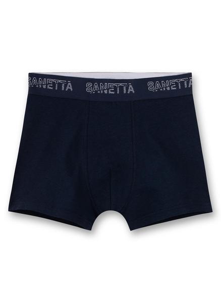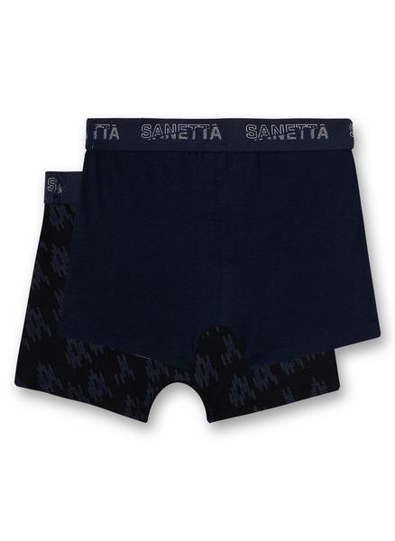 Hipshorts-Doppelpack von Sanetta aus einer unifarbenen Short in Dunkelblau und in schwarz mit einem minimalstischen Alloverprint für lässige Jungs.