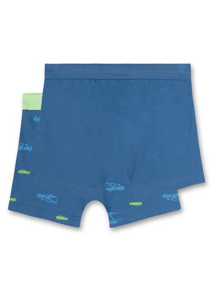 Modischer Doppelpack aus zwei Jungen-Shorts von Sanetta mit Auto-Alloverprint und unifarben in Blau.