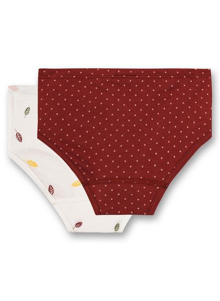 Modische Mädchen-Hipslips im Doppelpack von Sanetta im herbstlichen Blätter-Look und in Rot mit feinem Dots-Alloverprint.