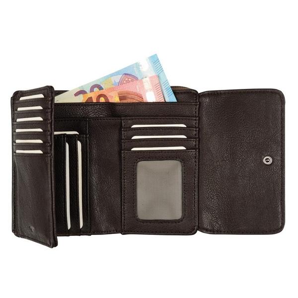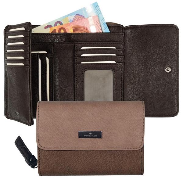 Ein weiterer Bestseller der TOM TAILOR-Börsenkollektion! Das Modell Elin besticht durch einen neuen, sehr harmonischen Material- bzw. Farbmix sowie die leicht kontrastfarbene Steppung. Überschlagbörse mit einem per Druckknopf zu schließenden Hauptfach mit 10 Kartensteckfächern, 2 Scheinfächern, 1 Ausweisfach, 1 Fotofach und 3 Steckfächern. Reißverschlussfach auf der Rückseite mit 2 Münzfächern und 1 Steckfach. Passend dazu ist 1 attraktiver Taschenstyle erhältlich.