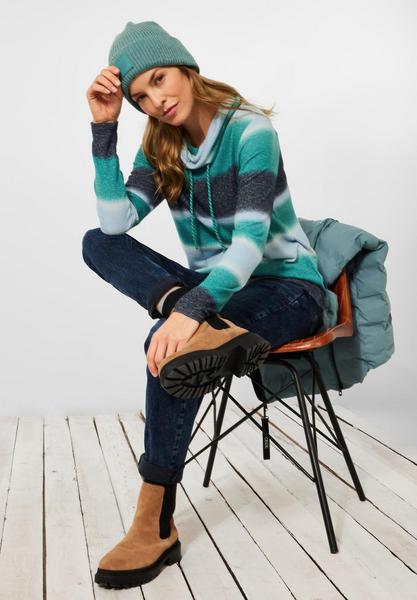 Run, Baby! Der große Kragen des Damen Langarmshirts von CECIL ist ein raffinierter Hingucker, der nebenbei auch noch den Hals angenehm warm hält. Durch das Tunnelzugband wirkt er dabei besonders lässig. Im farbenfrohen Streifen Dessin macht das Shirt auch bei grauem Wetter gute Laune.
