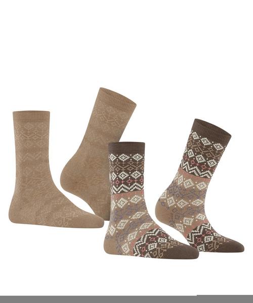 Schön gestricktes Norwegermuster findet sich nicht nur auf Pullovern, sondern auch auf den wadenhohen Socken. Damit werden die kuscheligen Damenstrümpfe mit Schurwolle inklusive geripptem Bündchen zur perfekten Ergänzung für winterliche Looks mit kernigen Boots oder flauschigen Hüttenschuhen. Die Socken sind im praktischen Doppelpack mit Uni-Socken erhältlich.