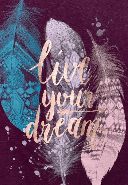 live your dream! Mit dem inspirierendem Wording bringt das Shirt Gute Laune in den Kleiderschrank. Der Federprint macht die Front zusätzlich zum Highlight und der Metallic-Effekt setzt schimmernde Highlights. Der Rundhalsausschnitt wird durch Rollkanten betont und die kurzen Ärmel runden das Design ab. Wie gemacht als Kombipartner zur Denim!\n\n\n Shirt mit Federprint\n Metallic-Effekt\n Rundhalsausschnitt\n Kurze Ärmel\n Rollkanten\n Maße bei EU-Größe XS ca.:\n Länge 60cm, Breite 44cm, Taille 44cm\n Material: 100% Baumwolle, neon apricot: 60% Baumwolle, 40% Polyester