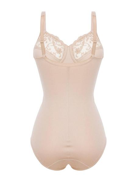 * Body ohne Bügel * Dreiteiliges Cup * Träger im Rücken elastisch und längenverstellbar * Elastische Beinabschlüsse - mittelhoher Beinausschnitt * Verstellbarer Häkchenverschluss mit Baumwollzwickel im Schritt * Außenträger - seitliche Cupstütze * Seitliche Cupstütze geht direkt in den breiten Träger über * Tüllstickerei im Ober Cup leicht transparent - Bauchbereich mit Powertüll unterlegt * U-förmiger Miederrücken * Trägerbreite angepasst an den Größenverlauf