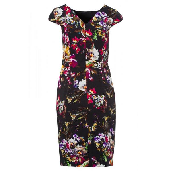 Das attraktive Kleid von MORE & MORE in schwarz mit buntem Flowerprint kann mit passendem Jäckchen oder kurzem Cardigan getragen werden.