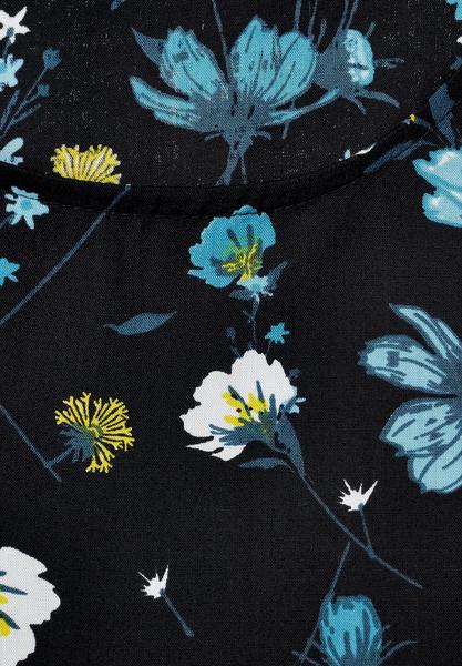 Feminines Trendteil: Die Bluse ist mit einem femininen Blumenmuster bedeckt. Durch den Elastiksaum und die softe Viskose sitzt es luftig und fühlt sich wunderbar weich an. Auch die langen Ärmel enden in einem Elastiksaum. Der Rundhalsausschnitt hat links und rechts einen Gummieinsatz mit Streifenmuster.\n\n\n Bluse mit Blumenmuster\n Elastiksaum\n Rundhalsausschnitt mit Elastikeinsatz\n Lange Ärmel mit Elastiksaum\n Maße bei EU-Größe M ca.:\n Länge 67cm, Brust 55cm, Saumweite 58cm\n Material: 100% Viskose