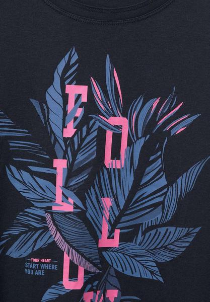 Follow me! Feminines Damenshirt von CECIL, das mit dem Rundhalsausschnitt ein perfekter Begleiter durch die letzten Sommertage ist. Hingucker ist der Fotoprint aus Wording und Blättern, der die Unifarbe zum Strahlen bringt. Die lässigen 3/4 Ärmel runden den Look ab.