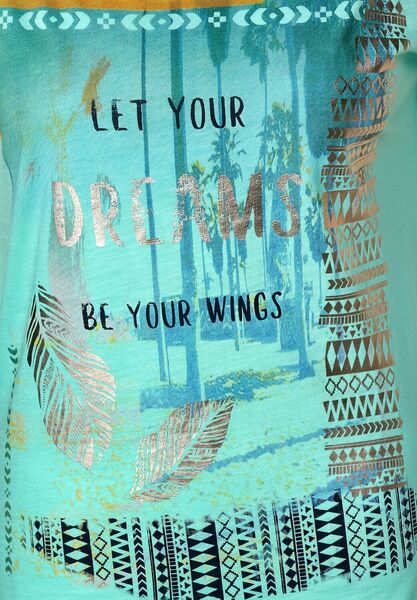 Let your dreams be your wings! Das T-Shirt von CECIL hat einen tollen Frontprint mit schimmernden Effekten an der Schrift und als Blättermotiv. Die Schultern werden durch einen Schlitz im Cold-Shoulder-Style feminin in Szene gesetzt. Am seitlichen Saum lassen sich zwei Bändchen knoten und der Rundhalsausschnitt liegt durch den weichen Materialmix bequem auf der Haut.\n\n\n T-Shirt mit Frontprint\n Schimmer-Effekte und Ethno-Design\n Schlitz im Cold-Shoulder-Style\n Rundhalsausschnitt\n Bändchen an der Seite\n Maße bei EU-Größe M ca.:\n Länge 65 cm, Brust 54 cm, Saumweite 53 cm\n Material: 50% Modal, 50% Baumwolle