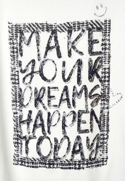 Make your dreams happen today! Das T-Shirt im sportlichen Schnitt begeistert mit inspirierendem Wording und passenden Prints. Die kurzen Ärmel sind perfekt für warme Sommertage geeignet. Mit dem weichen Baumwollmaterial ist ein angenehmes Tragegefühl auf der Haut garantiert.\n\n\n T-Shirt mit Wording und Print\n Rundhalsausschnitt\n Kurze Ärmel\n Gerader Schnitt\n Maße bei EU-Größe M ca.:\n Länge 66cm, Brust 51cm, Saumweite 53cm\n Material: 100% Baumwolle