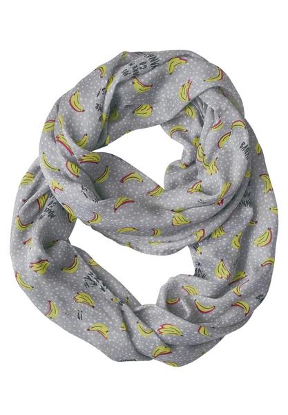 Der herrlich leichte Schlauchschal kommt mit einem frechen Bananen Print mit Wordings oder Vogel Print auf stylefreudigen Fondsfarben, die ihrem Outfit einen Frischekick verpassen. Das angenehm zu tragende Modalgewebe schmiegt sich zart und weich an die Haut an. In Standardbreite tragen Sie den Schal lässig zur Denim genauso easy wie zum Kleid.\n\n Zarter Schlauchschal in Standardbreite\n Frecher Bananen oder Vogel Print\n Angenehm zu tragen aus anschmiegsamen Modal\n Umfang ca. 160cm, Breite ca. 55cm\n Material: 100% Modal\n\n