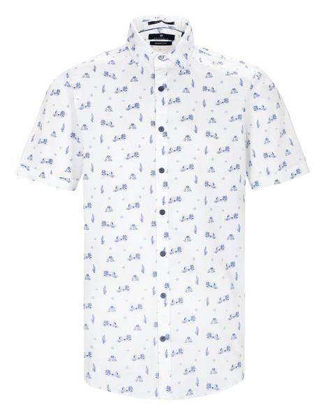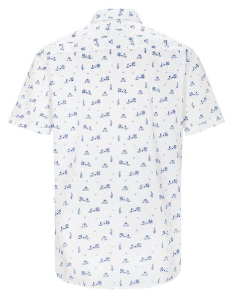 Lockern Sie Ihre Freizeit-Garderobe auf mit diesem Stretch-Halbarm-Hemd von BASEFIELD. hochwertige Stretch-Baumwolle Kent-Kragen, Allover-Muster kurze Ärmel mit fixiertem Abschluss aufgesetzte Knopfleiste mit Kontrastknöpfen Logo-Patch gummiert unten am Saum Passform: Modern Fit