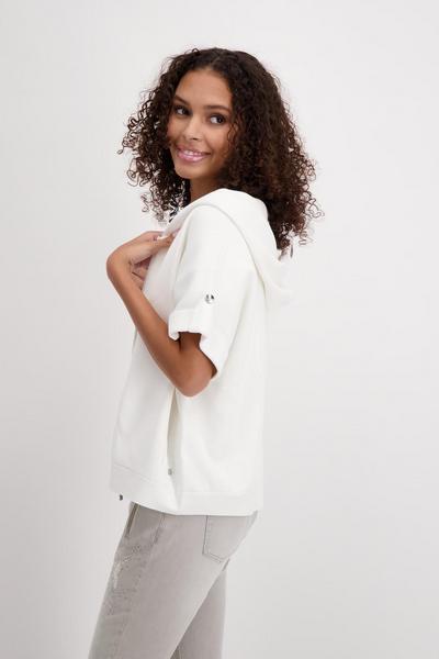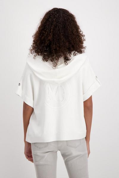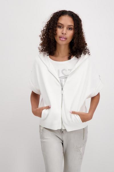 Mit der Halbarm-Strickjacke von monari erschaffen Sie tolle Looks in Handumdrehen. Das unkomplizierte Modell in Off-White besticht durch die gerade Form mit Kapuze, angedeutetem, überschnittenem Kurzarm, einer Stoffschnalle mit dekorativem Knopf am umgeschlagenen Ärmel und einem Saum mit Bündchen. Ein toniges Lackdruck-Emblem mit funkelnden Strasssteinchen schmückt die Rückseite der sonst eher schlichten Strickjacke. Fließende Viskose im Mix mit Polyamid sorgt für einen superangenehmen Tragekomfort. Tragen Sie die Jacke zum glamourösen T-Shirt mit glänzenden Details und einer schmalen Slim-Fit-Jeans mit Schmuckdetails, um eine echt geniale Kombi zu kreieren.