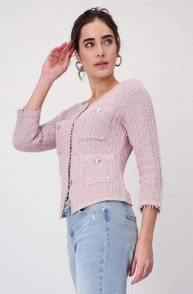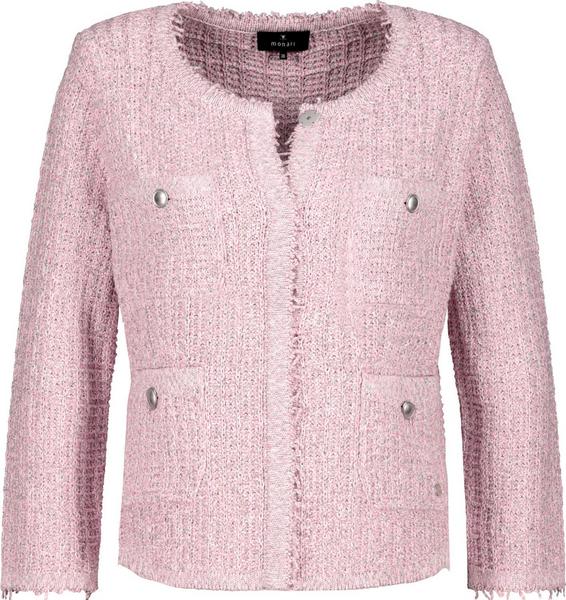 Elegante Jacke mit glitzerndem Lurexgarn und Tweed Stoff. Dekorative Knöpfe an den aufgesetzten Taschen.